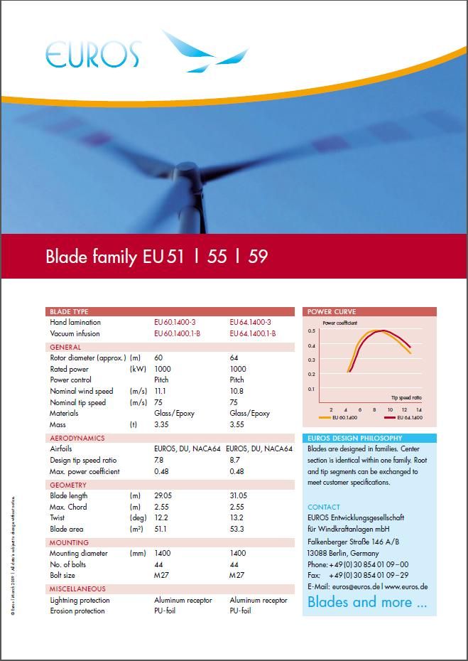 una velocidad de punta nominal de 75 m/s. La lámina se hace de vidrio y epoxi con mano