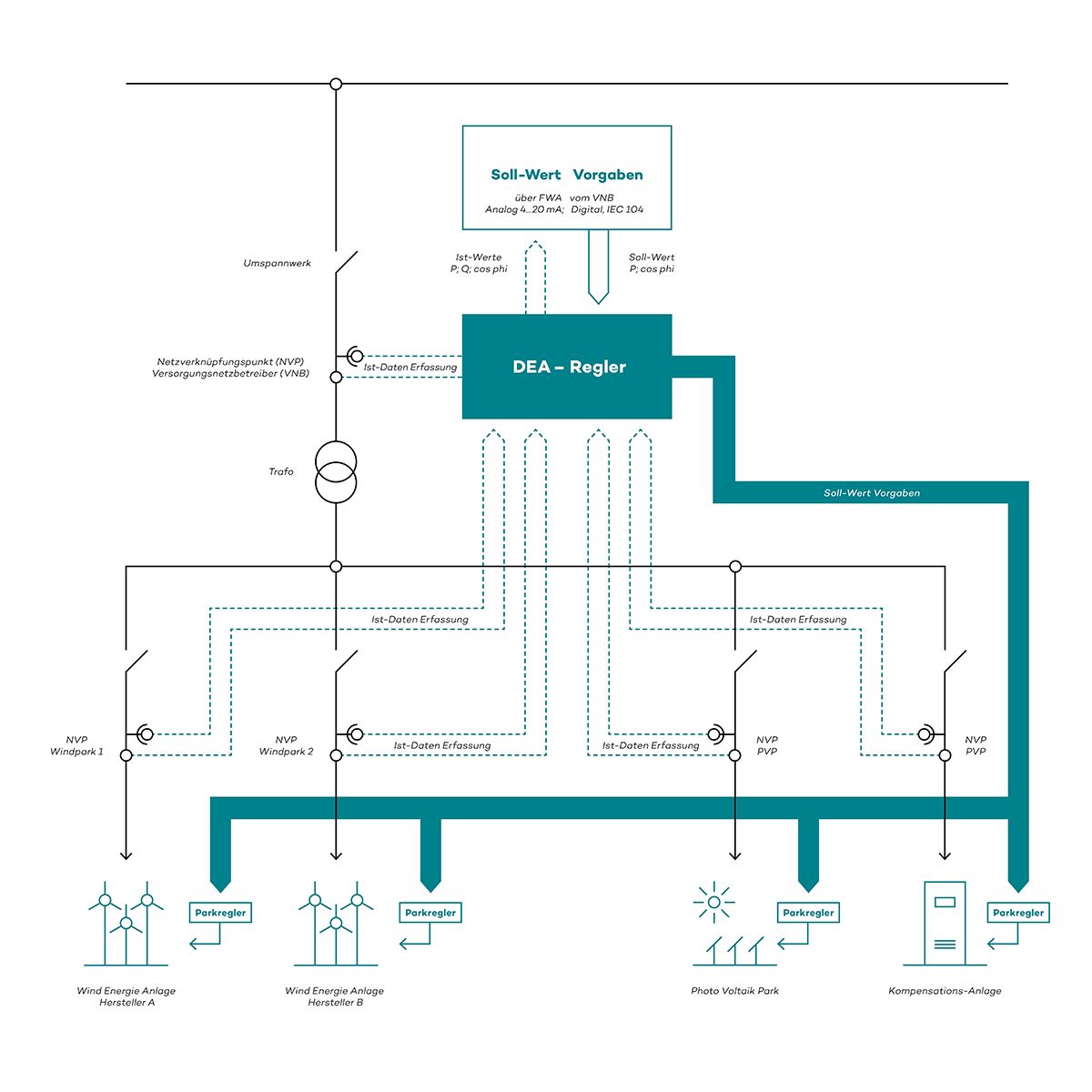 • El controlador DEA se puede utilizar para parques eólicos heterogéneos (aerogeneradores de diferentes fabricantes) y homogéneos, para conexiones a red en alta y media tensión y para sistemas acoplados en una conexión a red como parques eólicos con parques solares