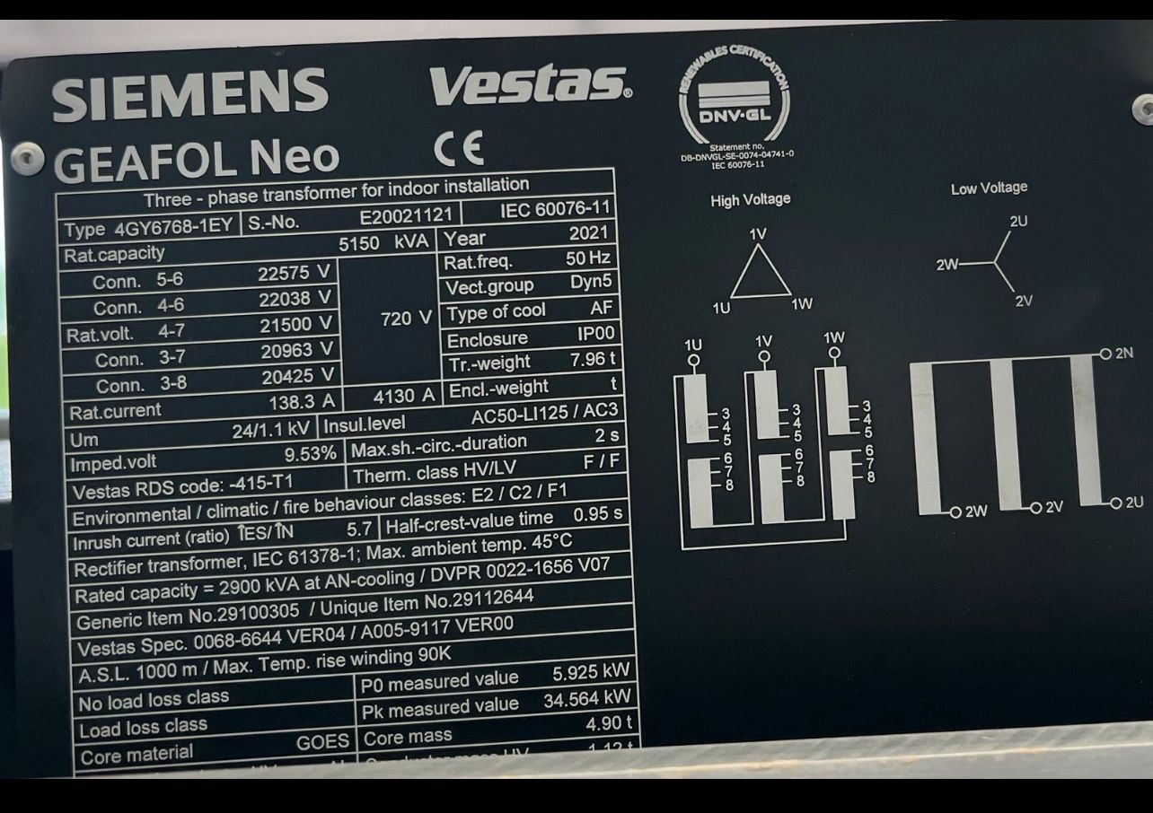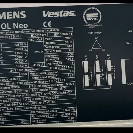 Estimado señor/señora, Ofrecemos un nuevo transformador para la planta de Vestas desde nuestro almacén para más detalles. Ver placa de identificación