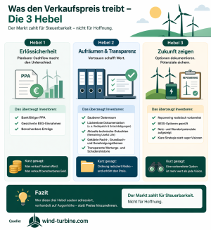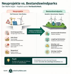 El mercado eólico de 2026 no ha perdido su encanto: solo ha cambiado sus reglas del juego. Los resultados de la licitación de primavera hablan por sí mismos: recargos de 5,2–6,1 ct/kWh, aumento de los tipos de interés, márgenes en caída. Los nuevos proyectos solo rinden frutos en condiciones ideales: sin retrasos, sin caídas de costes, sin choques externos. Esto no es equilibrio, es un acto de cuerda floja con viento en contra. La buena noticia es que cualquiera que gestione un parque existente de repente se encuentra sentado sobre un activo codiciado. Porque mientras los nuevos proyectos gestionan incertidumbres, las inversiones existentes ofrecen lo que más aman a los inversores ahora mismo: estabilidad, previsibilidad y flujo de caja desde el primer día. El capital busca seguridad – y la encuentra en edificios existentes. Este editorial está dirigido específicamente a los operadores de parques eólicos existentes que estén pensando en vender o que deseen reevaluar su posicionamiento estratégico. El artículo se complementa con una entrevista de expertos al final.