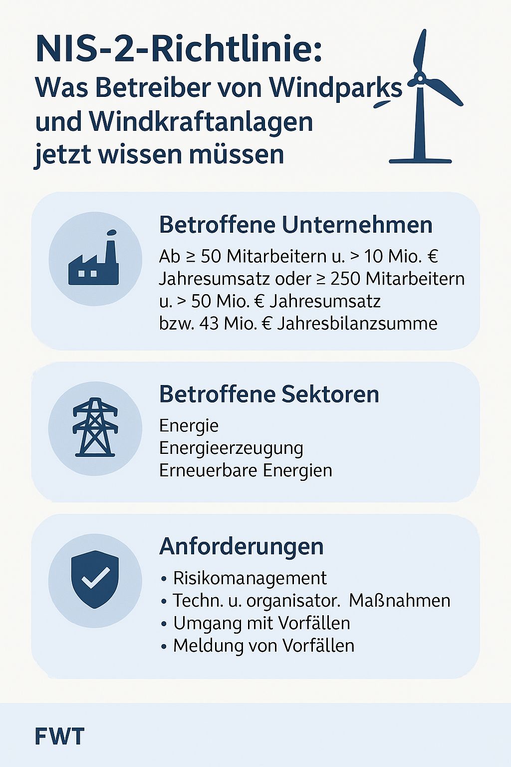 Una visión general informativa para los participantes del mercado en la industria eólica alemana, como las empresas operadoras, los proveedores de servicios y los proveedores de energía. Con la Directiva (UE) 2022/2555 SRI 2 sobre el refuerzo de la ciberseguridad en la Unión, la UE persigue el objetivo de aumentar significativamente la resiliencia de las infraestructuras críticas frente a las ciberamenazas. La directiva sustituye a la anterior Directiva NIS de 2016 y debe transponerse a la legislación nacional antes de octubre de 2024, en Alemania a través de la llamada Ley de Implementación y Fortalecimiento de la Ciberseguridad NIS-2 (NIS2UmsuCG).